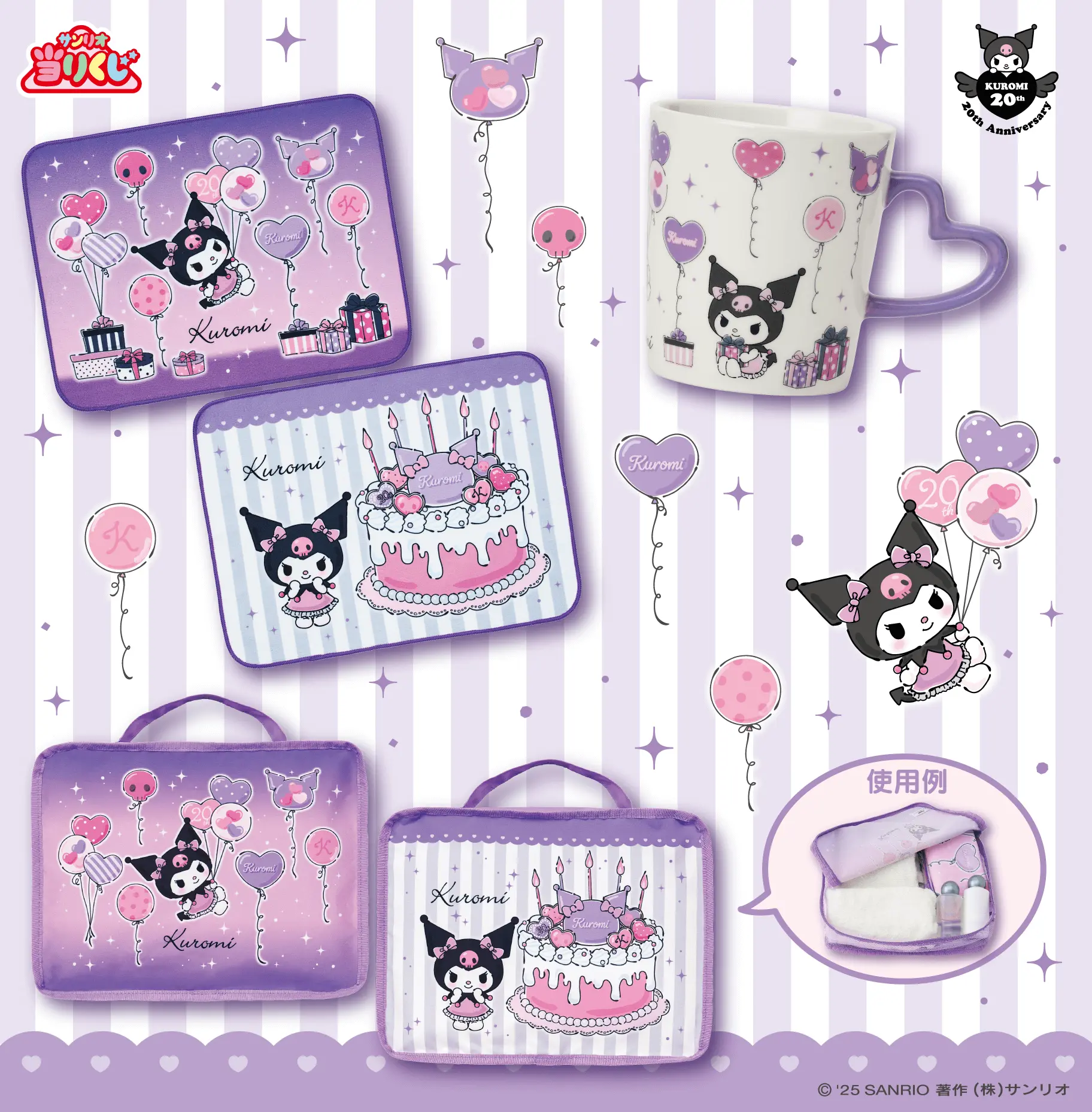為紀念《酷洛米》20 週年推出的第二彈一番賞,再次讓粉絲們為之瘋狂!這次的主題以氣球與蛋糕為設計靈感,整體視覺以夢幻的粉紫色為主軸,呈現出可愛又不失個性的氛圍。獎品實用又療癒,從出國旅行能用的迷你行李箱、居家必備的拖鞋與收納包,到每天都能用到的馬克杯與化妝包,讓你從早到晚都被酷洛米的魅力包圍!