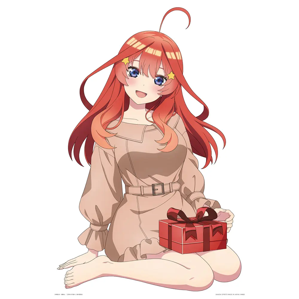 F~J 賞為 居家約會主題壓克力板,五胞胎穿上舒適可愛的居家服,坐在你面前輕聲微笑,那份日常中的甜蜜感觸近在眼前。K 賞為可站立的 壓克力立牌,展現她們幸福燦笑的樣子,超適合桌上收藏!L 賞是 雙面設計的門牌板,上面還有附加訊息,可裝飾於房門或櫃子,生活中也能感受到「五等分」的陪伴!M 賞則為 透明資料夾與貼紙組,實用與收藏兼具。最後賞則是全新概念的 「超特大布掛」,描繪大人版本的五胞胎與風太郎在「喫茶中野」共度生日派對的珍貴一刻,以超大尺寸完整呈現感動場景,是五等分粉絲絕對不能錯過的最終收藏神物!