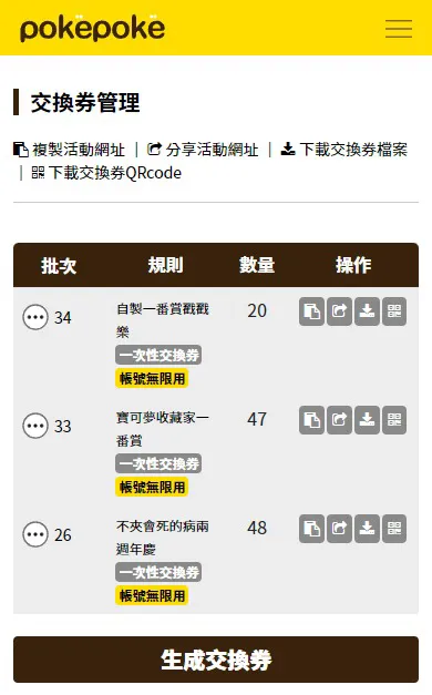 在選單活動管理 > 交換券管理這裡面你可以看到目前已經產生的交換券抽獎序號。