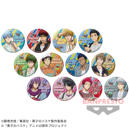 為了慶祝《黑子的籃球》動畫10週年,特別推出紀念款徽章。每一款都用上角色的全身插圖,一共有12種可以收集。