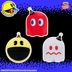 這是PAC-MAN 45週年紀念版本的絨毛娃娃組,包含PAC-MAN和鬼怪角色,帶有球鍊吊飾設計。共有3款,尺寸約7cm。